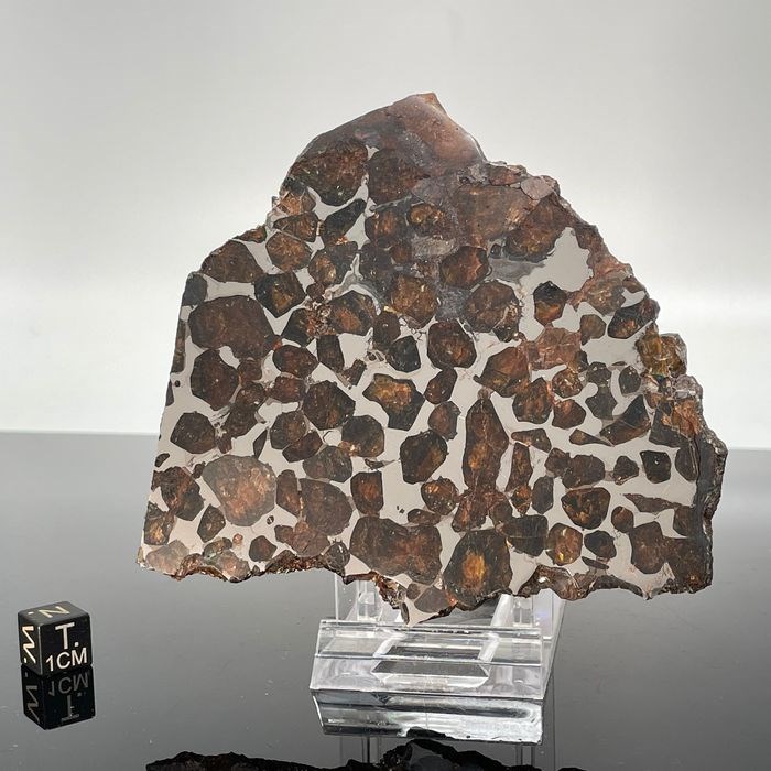 Schitterende plak pallasiet waarin we spectaculaire olivijnen kunnen zien.