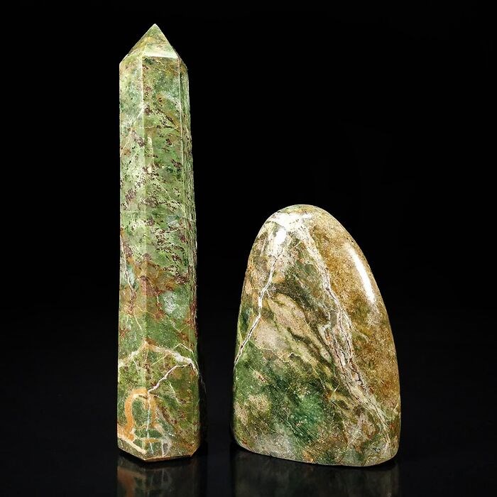 Prachtig paar chrysopraasmineralen van behoorlijke omvang en gewicht. Je kunt zien hoe hetzelfde mineraal in verschillende vormen kan worden verwerkt.