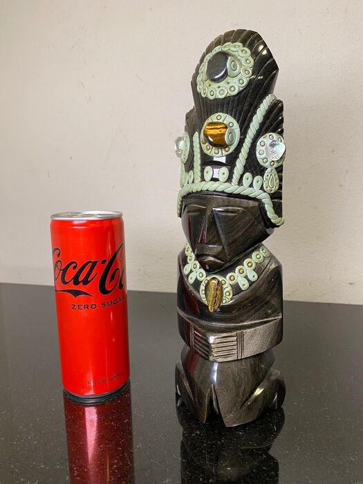 Prachtige en zeldzame Goud Obsidiaan Maya krijger sculpture. Beeldje van uitzonderlijke vorm en grootte voor Goud Obsidiaan. Versierd met verschillende andere mineralen waaronder Tijgeroog.