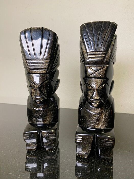 Prachtige set van twee grote Goud Obsidiaan Maya krijger sculpturen.