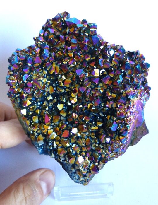Amethist druse behandeld met edele metalen zoals titanium, goud, kobalt, platina en zilver, waardoor de energie van de kristallen wordt versterkt, wat ook resulteert in oogverblindende kleuren met kostbare regenbogen.