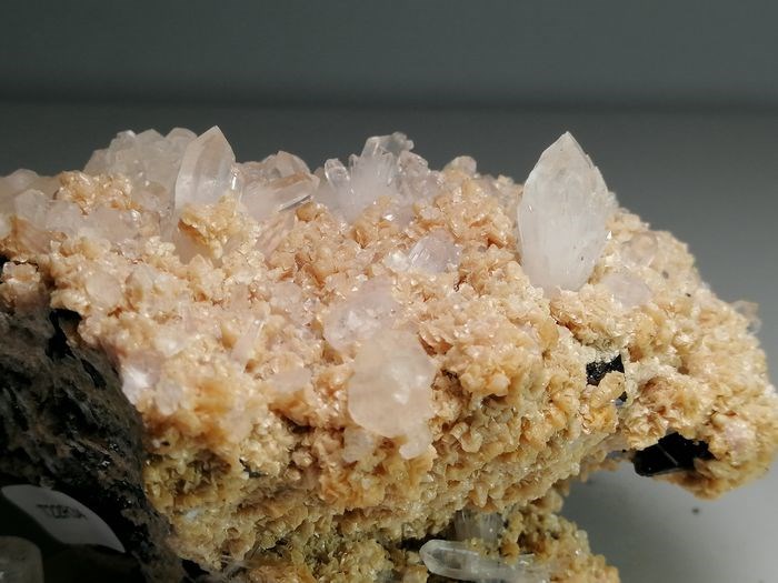 een mooi staaltje rhodochrosiet samen met centimeter kwartskristallen