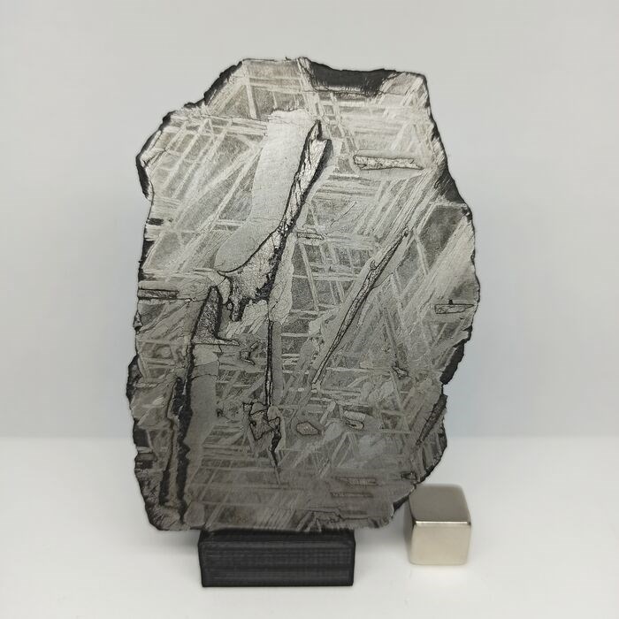 Het exemplaar in dit kavel is een schijf van hoge kwaliteit, van een goede grootte en in een uitstekende staat van bewaring, waarin u de spectaculaire Widmanstatten-lijnen op een van de zijden kunt zien en gepolijst op de andere, met de fusiekorst op de andere, de omtrek. De inwendige structuur van deze meteoriet is octaedriet. Als u beide zijden wilt laten graveren en Widmaststten Lines wilt hebben, laat het ons weten en wij zullen het voor u doen voordat het wordt verzonden.