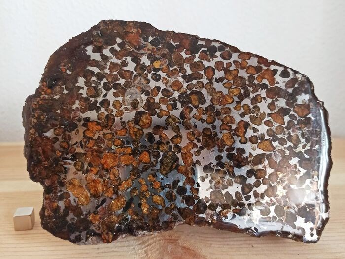 In dit kavel veilen we een verbazingwekkende laatste snede van Sericho, een meteoriet van het pallasiet-type, voor het eerst gevonden in Kenia in 2016. Het is een snede waarin we kostbare olivijnen kunnen waarderen die in één deel in zijn metalen matrix zijn verdeeld, zoals evenals de natuurlijke fusie van de korst aan de andere kant. Behandeld met hars en elektrolyse om oxidatie zoveel mogelijk te voorkomen. Ideaal formaat en kwaliteit voor een grote collectie of museum!