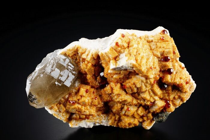 Fantastische spessartine granaten op ROOKKWARTS met hyaliet (opaal) op witte veldspaat (UV) matrix.
