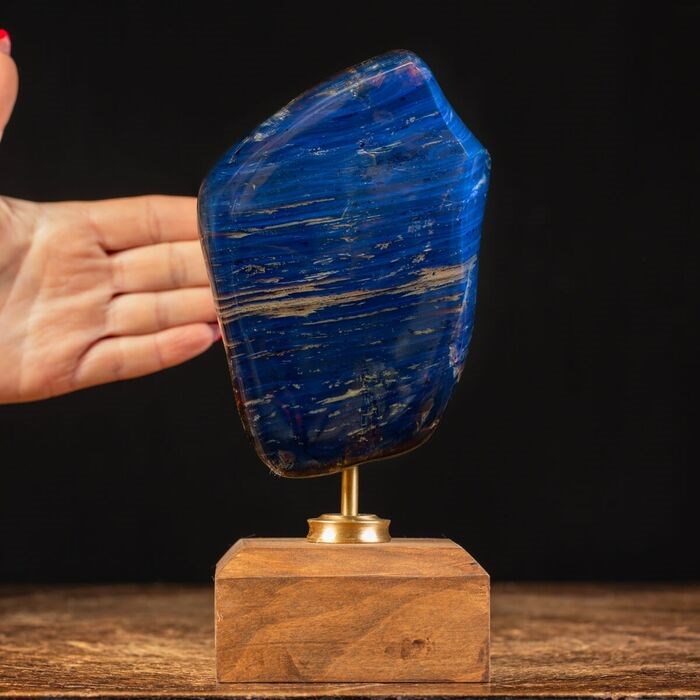 Een prachtige vondst, een meer uniek dan zeldzaam verzamelobject, een spectaculair stuk Sumatraanse blauwe amber van grote afmetingen, gemonteerd op een elegant voetstuk van hout en messing.