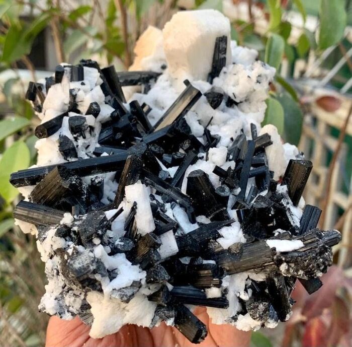 Natuurlijke, goed afgesloten combinatie van toermalijnkristallen met Rose Albite-monster op matrix. Zeer zeldzaam kristal en het is zeer moeilijk om zo'n schadevrij exemplaar in natuurlijke vorm te vinden. Zeer goede gelegenheid voor verzamelaars om deze schoonheid aan hun collectie toe te voegen.