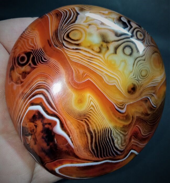 Deze verbazingwekkende vondst is afkomstig uit het stroomgebied van de abetsiboka in de buurt van Vitataly, Madagaskar, bekend als de Mad River. Beschikt over verbazingwekkende banden en patronen. Terwijl de steen natuurlijk gedolven materiaal is en de strepen en patronen allemaal natuurlijk zijn, wordt het materiaal geverfd om de kleur in de agaat te creëren door te weken in een minerale oplossing. De kleuring sijpelt in verschillende hoeveelheden in de gestreepte lagen van agaat, afhankelijk van de zuiverheid van het kristal in die laag, wat resulteert in de prachtige gestreepte kleurlagen.
