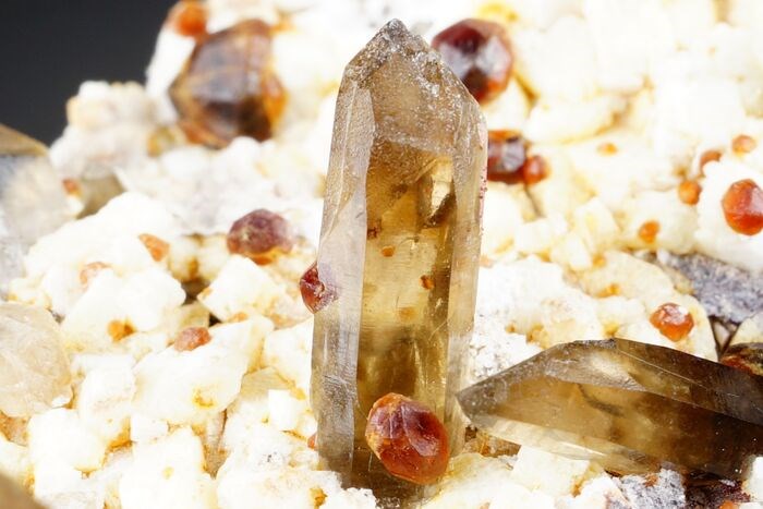 Fantastische spessartine granaten op ROOKKWARTS met hyaliet (opaal) op witte veldspaat (UV) matrix.