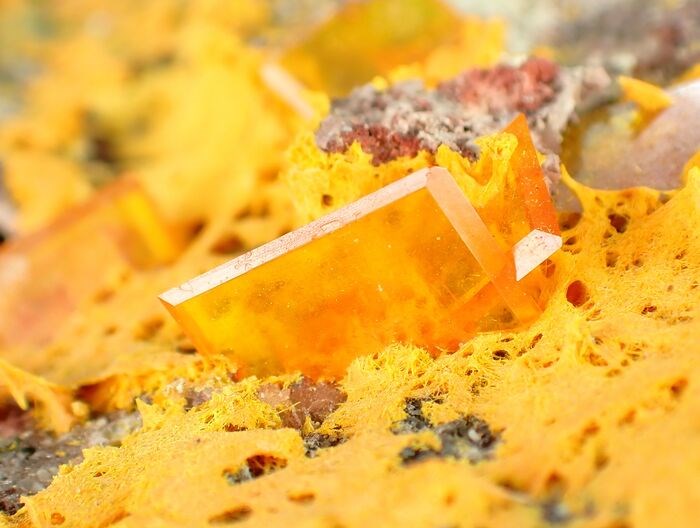Hier hebben we levendige oranje Wulfenite-kristallen op matrix. Goed gevormde transparante "blades" kristallen met scherpe randen en kleine beschadigingen. Geweldig exemplaar voor elke verzameling.