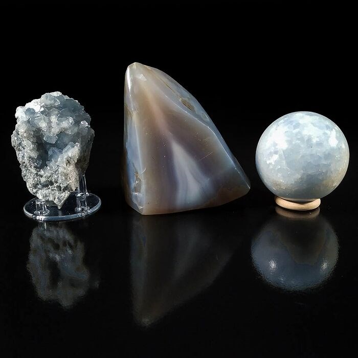 Prachtig trio van mineralen met een lichtblauwe kleur. We wilden een batch maken waarbij de blauwe kleur de belangrijkste factor was. In deze batch vinden we drie verschillende soorten mineralen in drie verschillende processen. We hebben een vrij gevormd blok van blauwe agaat, een geode van celestine en een bol van calciet.