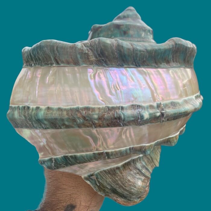 Schitterende grote schelp, een Turbo Marmoratus Banded, met een prachtige constructie en de typische kleuren bruin, groen en zeer decoratieve parelmoer strepen.