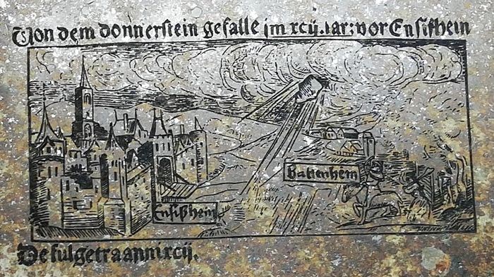 2 Lasergravures van de beroemde Ensisheim-waterval op niet-geclassificeerde NWA-chondriet. Volle plak.
