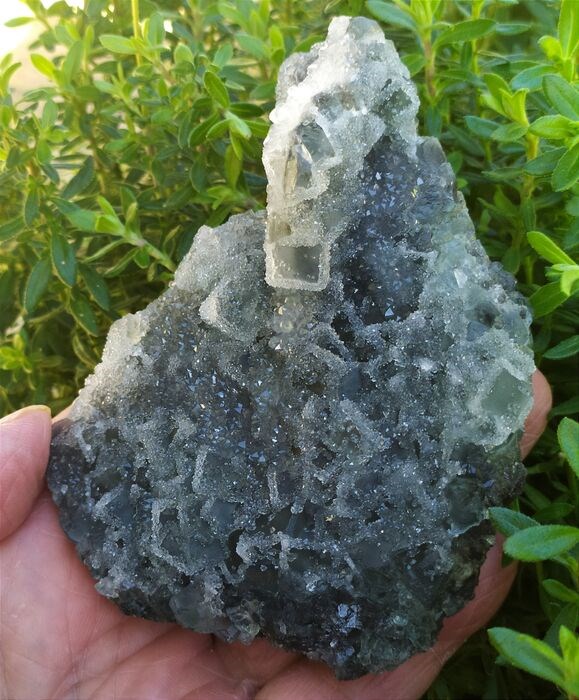 Mooie en uitzonderlijke kubusvormige kristallen van Groene Fluoriet bedekt met een kristallisatie van Kwarts die echt lijkt op gelkristallen. Exemplaar van adembenemende esthetiek!! Gewicht 315,40 g. Afmetingen: 105x90x32mm. Herkomst: provincie Fujian, China.