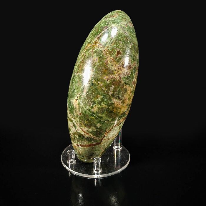 Spectaculaire chrysopraas lingam uit Madagaskar. Gemonteerd op op maat gemaakte transparante plastic standaard.