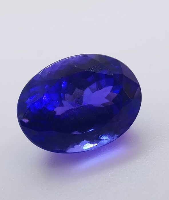 Loupe zuivere intense vivid deep purplish blue color, 4.11 carat, ovaal geselepen natural Tanzaniet.