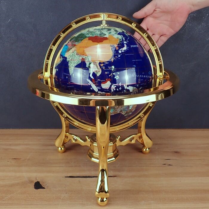 Schitterende bol van lapis lazuli en andere edelstenen. Elk land is ingelegd met de edelsteen ervan (dit is niet altijd gelukt, aangezien niet alle landen van de wereld de thuisbasis zijn van edelstenen). De wereldbol is volledig met de hand ingebracht en wordt beschermd door een plastic coating, dus het is geen probleem om de wereldbol te draaien. En een prachtig kompas onder het middelpunt van de wereldbol.