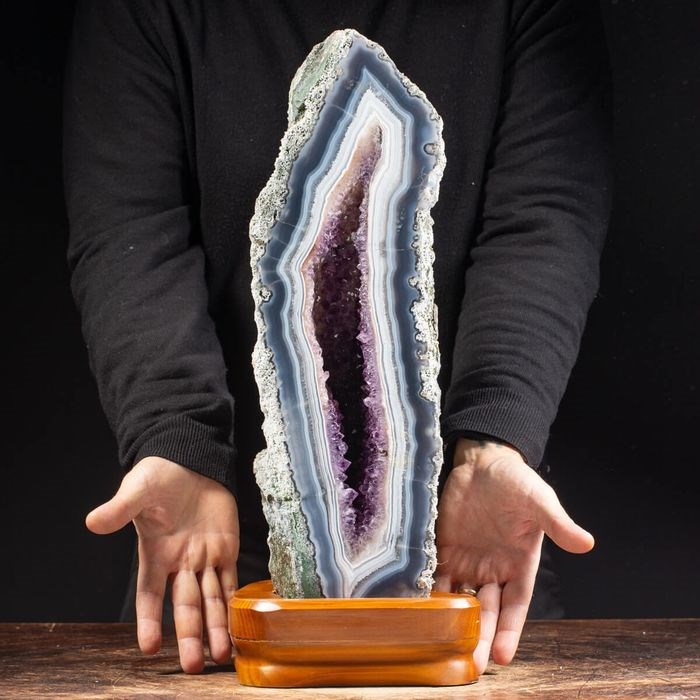 De elegantie van de tijd is ingekapseld in deze geode die alle schoonheid van de natuur uitdrukt op een houten voet.