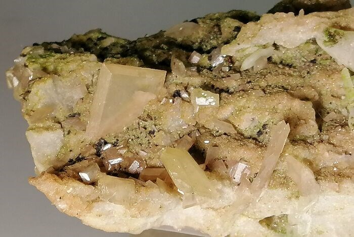 Een mooi exemplaar uit de oude Perego collectie. wulfenietkristallen tot 1 cm op smithsoniet en duftiet