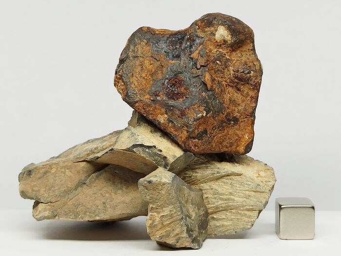In dit kavel presenteren we een compleet stuk Agoudal metallic meteoriet (76 g) van ideale grootte voor verzamelaars + een Shatter Cone-inslagstructuur (76,8 g)