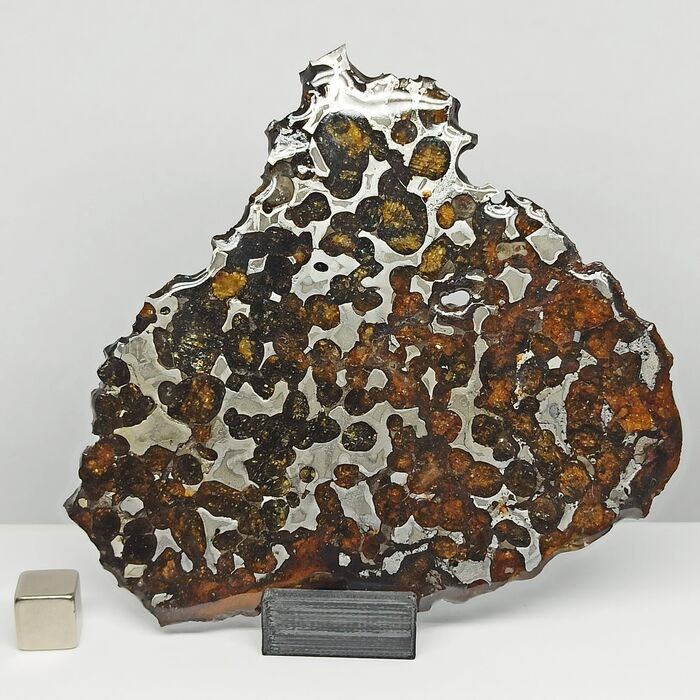 In dit kavel veilen we een verbazingwekkende schijf van Sericho, een meteoriet van het pallasiet-type, voor het eerst gevonden in Kenia in 2016. Het is een schijf waarin we kostbare olivijnen kunnen waarderen die zijn verdeeld in zijn metalen matrix, waarvan er verschillende doorschijnend zijn. Het is geëtst met salpeterzuur, waardoor het ijzer-nikkelpatroon zichtbaar wordt. Elektrolyse behandeld en gelakt om oxidatie zoveel mogelijk te voorkomen. Ideaal formaat en kwaliteit voor een grote collectie.
