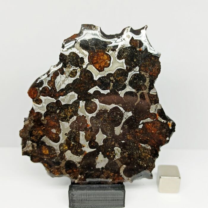 In dit kavel veilen we een verbazingwekkende schijf van Sericho, een meteoriet van het pallasiet-type, voor het eerst gevonden in Kenia in 2016. Het is een schijf waarin we kostbare olivijnen kunnen waarderen die zijn verdeeld in zijn metalen matrix, waarvan er verschillende doorschijnend zijn. Het is geëtst met salpeterzuur, waardoor het ijzer-nikkelpatroon zichtbaar wordt. Elektrolyse behandeld en gelakt om oxidatie zoveel mogelijk te voorkomen. Ideaal formaat en kwaliteit voor een grote collectie.