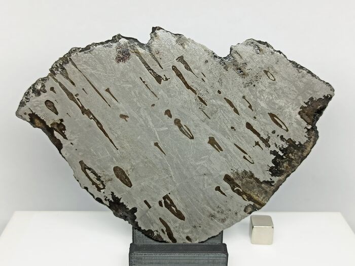 In dit kavel presenteren we een compleet stuk DRONINO metaalmeteoriet, geclassificeerd als ataxiet omdat het geen Widmanstatten-patroon vertoont, de ideale maat voor grote verzamelaars in perfecte staat, met een uitstekende gravure waarin verschillende structuren te zien zijn, en met museum kwaliteit. Gesneden met diamantdraad krijgen we een groot oppervlak in verhouding tot het gewicht. We streven ernaar om de beste plakjes op de markt te hebben.