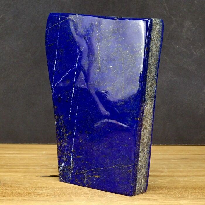 Hier ziet u een zeer decoratieve natuurlijke blauwe lapis lazuli-pyriet-vrije vorm.De vorm en het diepe blauw met de prachtige gouden pyriet insluitsels maken het een zeer mooi decoratie object. Een groot stuk dat elke kamer een beetje mooier maakt. Echt uniek.
