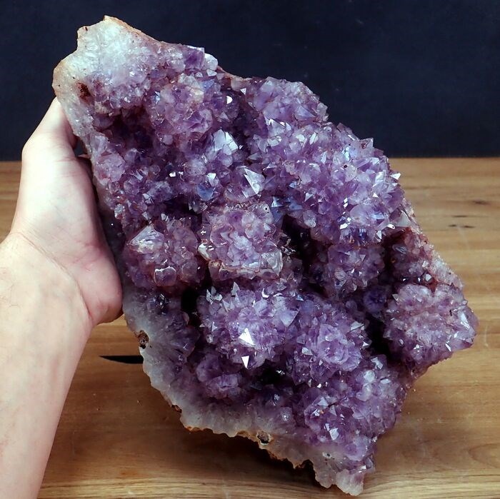 Ongelooflijk stuk amethist gevormd door meerdere grote en dikke kristallen van een prachtige paarse kleur bedekt met kleine en heldere kwarts. Geweldige glans en esthetiek.