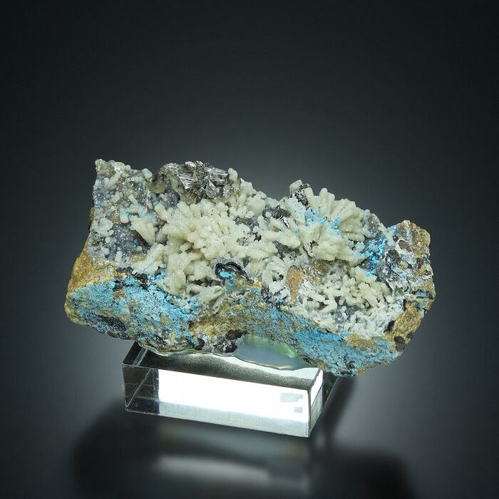 Ongebruikelijke Sneeuwvlok Cerussiet op Kwarts pseudomorf naar Hemimorfiet met klein Shattuckiet op Matrix.