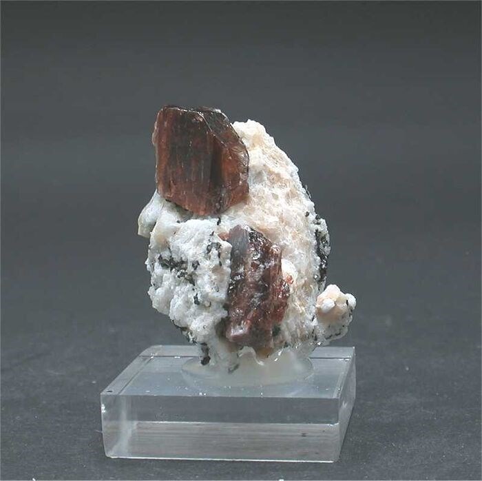 Harcho, Astore Valley, Gilgit-Baltistan, Pakistan - Felrode zirkoonkristallen op matrix, het hoofdkristal is 1,2 cm groot. Hoewel de achterkant niet perfect is vanwege het contact met de matrix, is het een groot kristal! er is ook een onvolledige zirkoon op het onderste deel van het exemplaar. Leuke klassieker uit Pakistan van exemplaar van 3,5 x 3,5 x 2,5 cm. Gewicht is 35 gr.