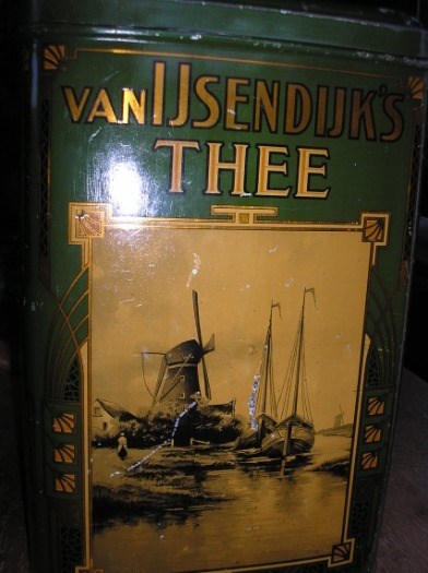 Rotterdam , thee blik oud - theeblik met “koninklijke nederlandsche stoomkoffiebranderijen h.e. Van ijsendijk jr. Rotterdam” - beschrijving: vierkant, hoog blik met scharnierend deksel. Op de vier zijden en het deksel zijn zwart-wit foto's opgenomen tegen een donkergroen fond. Deze voorstellingen worden ingekaderd door en versierd met goudkleurige art-deco-achtige lijnen. Voorzijde: drie fotografische afbeeldingen van de firmavestigingen in rotterdam, antwerpen en zwolle. De drie zijden en het deksel dragen afbeeldingen waarop water en zeilboten het hoofdbestanddeel vormen. Herkomst de koffiebranders van ijsendijk waren gevestigd aan leuvehaven 69-73 (1930). Trefwoorden theebus, blik, productverpakking, houder opschrift / merk voorzijde: "koninklijke nederlandsche stoomkoffiebranderijen h.e. Van ijsendijk jr. Rotterdam. Deksel en drie zijden: van ijsendijk's thee". Minuscuul op achterzijde deksel: "v.b.". Vervaardiger fabrikant: verblifa plaats vervaardiging nederland, krommenie datering 1920 - 1925 technieken gelithografeerd, bedrukt, geperst, gefelst, gelakt, blik, vertind materiaal ijzer, tin, verf afmetingen (cm) hg 33,0 / br 21,0 / dp 21,0, - - prijs 42,50 - - tip: neem een kijkje bij mijn overige advertenties, wie weet staat er iets bij