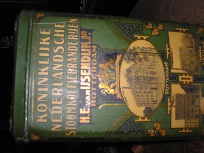 Rotterdam , thee blik oud - theeblik met “koninklijke nederlandsche stoomkoffiebranderijen h.e. Van ijsendijk jr. Rotterdam” - beschrijving: vierkant, hoog blik met scharnierend deksel. Op de vier zijden en het deksel zijn zwart-wit foto's opgenomen tegen een donkergroen fond. Deze voorstellingen worden ingekaderd door en versierd met goudkleurige art-deco-achtige lijnen. Voorzijde: drie fotografische afbeeldingen van de firmavestigingen in rotterdam, antwerpen en zwolle. De drie zijden en het deksel dragen afbeeldingen waarop water en zeilboten het hoofdbestanddeel vormen. Herkomst de koffiebranders van ijsendijk waren gevestigd aan leuvehaven 69-73 (1930). Trefwoorden theebus, blik, productverpakking, houder opschrift / merk voorzijde: "koninklijke nederlandsche stoomkoffiebranderijen h.e. Van ijsendijk jr. Rotterdam. Deksel en drie zijden: van ijsendijk's thee". Minuscuul op achterzijde deksel: "v.b.". Vervaardiger fabrikant: verblifa plaats vervaardiging nederland, krommenie datering 1920 - 1925 technieken gelithografeerd, bedrukt, geperst, gefelst, gelakt, blik, vertind materiaal ijzer, tin, verf afmetingen (cm) hg 33,0 / br 21,0 / dp 21,0, -