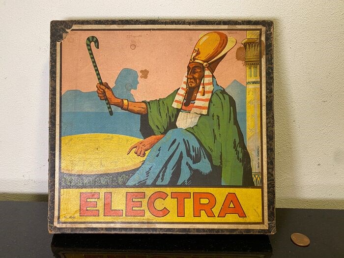 Antiek en zeldzaam Electra educatief bordspel uit de jaren ‘30 met steendruk afbeelding met Egyptische farao van de Duitse spelletjes firma uit de tijd DRGM. Gemaakt in het Nederlands voor de Nederlandse markt.