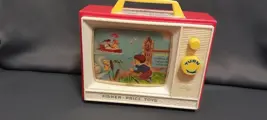 Vintage Fisher Price Toys, TV met muziek, bewegende beelden, plastic en hout 25/22/9cm, jaar 1964, Patent Canada, Made in Japan, werkend