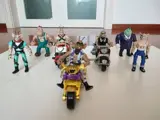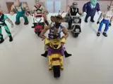 7 figuurtjes uit de bekende serie Biker mice from Mars uit de jaren 90. Het enige mankement wat op de foto's te zien is is dat er een klein stukje stuur mist van de gele fiets