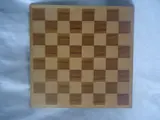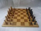 Afmetingen schaakbord: 31,5 x 31,5 cm, pionnen 3 cm, koning 7 cm.
