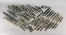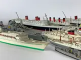Grote partij loden modelschepen van verschillende afmetingen.