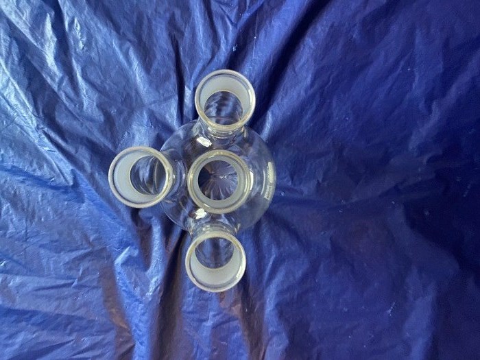 Rondbodemkolf 500ml 4-hals +NS29(laboratorium,destillatie)4 hals rondbodem kolf 500ml met 4 rechte hulzen NS29/32:Merk Schott duranVerzendkosten koper €8,25