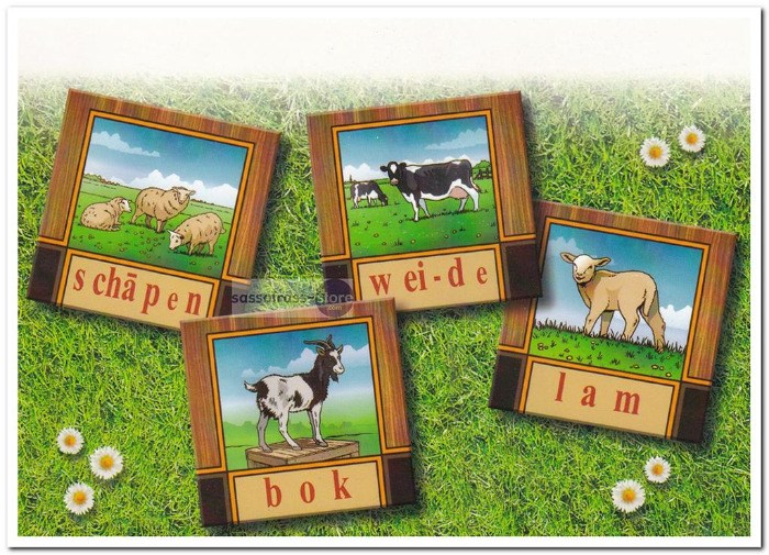 Ansichtkaart met 4 afbeeldingen van het leesplankje: schapen, wei-de, lam en bok