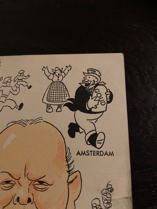 Duitse anti Winston Churchill spotprent op W.C.. Verwijzingen naar Narvik, Amsterdam, Duinkerken en Dakar met spot op Engeland. Twee perforatiegaatjes en kleine scheur rechtsvoor.