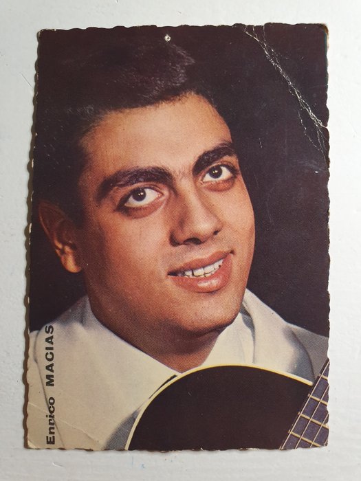 6 kleine kaarten hebben vouwen (Enrico Macias, Hervé Villard, The Beatles, Elvis Presley, Bernadette Lafont).