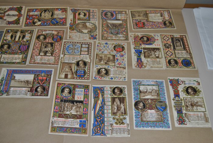 Onvolledige serie van 70 ansichtkaarten met de chronologie van de pausen. Elk van de ansichtkaarten, gedrukt door het Armanino-huis in Genua, droeg het portret van de paus, zijn wapen en een plaquette met de naam, plaats en geboortejaar van de verkiezing tot pontificaat.