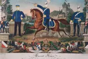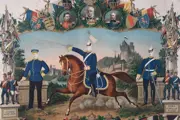 de soldaat Conrad Moser, waarschijnlijk eind 19e eeuw. Kleurenlithografie met ingezette portretten, ingelijst achter glas. Het document is in goede staat, de antieke lijst is door de leeftijd in zwaar gebruikte staat, zie foto's.