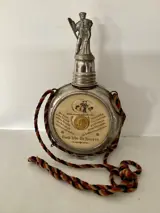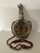 Schnappsfles uit de keizertijd met portretmedaillion vankeizer Wilhelm, dat als draaiknop dient en waarmee vier verschillende afbeeldingen kunnen worden getoond. Aan de andere kant een open scharnierend plaatje en de gebruikelijke reservistenleuzen.