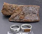 Zie foto's. 2 patriottische ringen, binnendiameter ca. 17 mm en 20 mm en een granaatscherf?