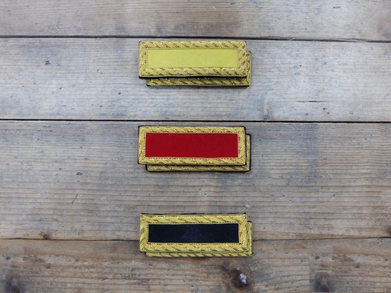 Te koop Set van 2 schouder rang embleems.Rang 2e Luitenantafmeting 20 cm x 16 cmook verkrijgbaar inGeel = CavalerieRood = ArtillerieBlauw = Infanterie.Zwart = generale stafVerzendkosten €.3,90