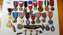 Lot van 28 medailles en speldjes uit Frankrijk en België uit verschillende periodes en originelen.