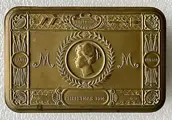 Het is een prachtig bewerkte tabaksdoos. De deksel is gedubbeld met in reliëf op de bovenzijde centraal het borstbeeld van prinses Mary, langs de randen perken met onder in schildje "CHRISTMAS 1914", aan weerszijden "FRANCE" en "RUSSIA", bovenlangs "IMPERIUM BRITTANICUM", in de hoeken "BELGIUM", "JAPAN", "SERVIA" en "MONTE NEGRO".