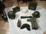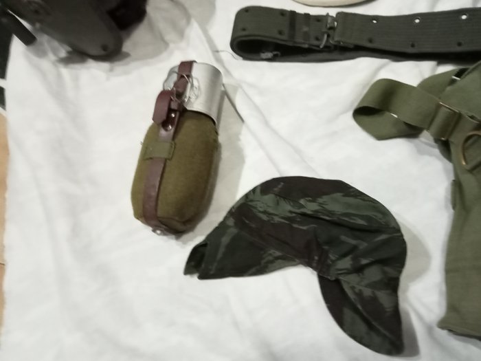 geplaatste mortalo da 81 3 colpi completi a piccola capacitá, munitiezak machinegeweer in goede staat, Portugese troepenkiko, commandoriem, luchtdichte veldfles met aluminium beker Portugese luchtmachthelm uit de jaren 60 en Poolse stalen helm met interieur in leer in zeer goede staat , partijgewicht van meer dan 10 kg verzending bijgehouden en goed verpakt.